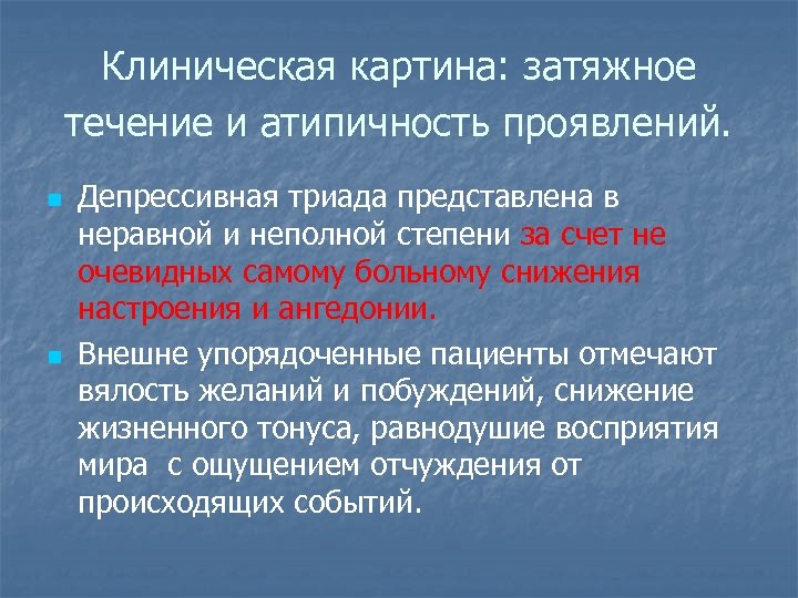 Клиническая картина: затяжное течение и атипичность проявлений. n n Депрессивная триада представлена в неравной и неполной степени за счет не очевидных самому больному снижения настроения и ангедонии. Внешне упорядоченные пациенты отмечают вялость желаний и побуждений, снижение жизненного тонуса, равнодушие восприятия мира с ощущением отчуждения от происходящих событий.
