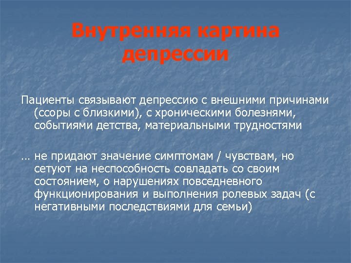 Внутренняя картина депрессии Пациенты связывают депрессию с внешними причинами (ссоры с близкими), с хроническими болезнями, событиями детства, материальными трудностями … не придают значение симптомам / чувствам, но сетуют на неспособность совладать со своим состоянием, о нарушениях повседневного функционирования и выполнения ролевых задач (с негативными последствиями для семьи)