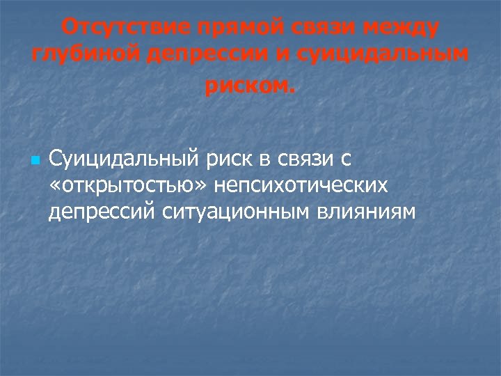 Отсутствие прямой связи между глубиной депрессии и суицидальным риском. n Суицидальный риск в связи с «открытостью» непсихотических депрессий ситуационным влияниям