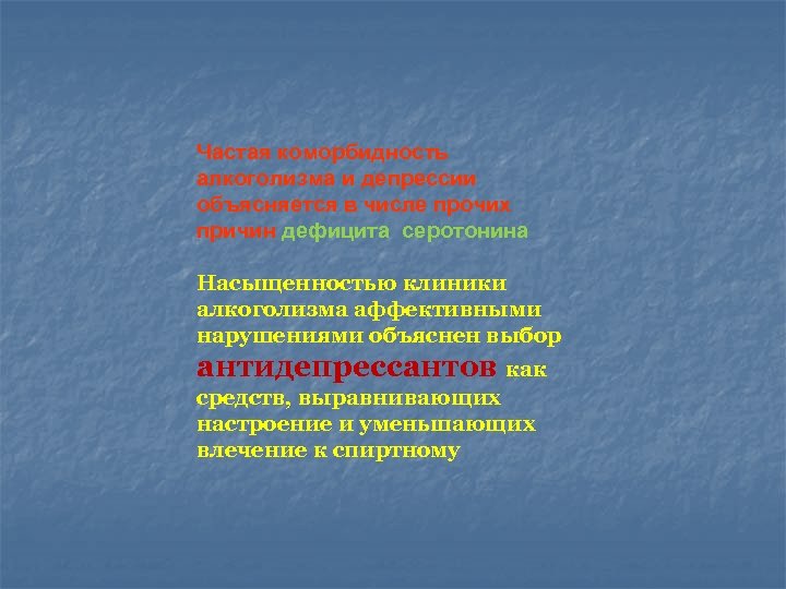 Частая коморбидность алкоголизма и депрессии объясняется в числе прочих причин дефицита серотонина Насыщенностью клиники алкоголизма аффективными нарушениями объяснен выбор антидепрессантов как средств, выравнивающих настроение и уменьшающих влечение к спиртному