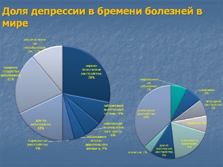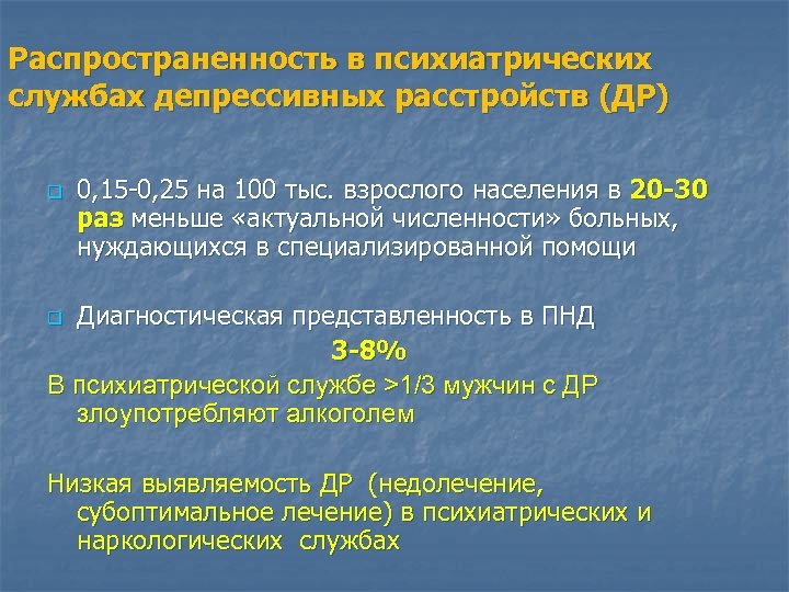 Распространенность в психиатрических службах депрессивных расстройств (ДР) q 0, 15 -0, 25 на 100 тыс. взрослого населения в 20 -30 раз меньше «актуальной численности» больных, нуждающихся в специализированной помощи Диагностическая представленность в ПНД 3 -8% В психиатрической службе >1/3 мужчин с ДР злоупотребляют алкоголем q Низкая выявляемость ДР (недолечение, субоптимальное лечение) в психиатрических и наркологических службах
