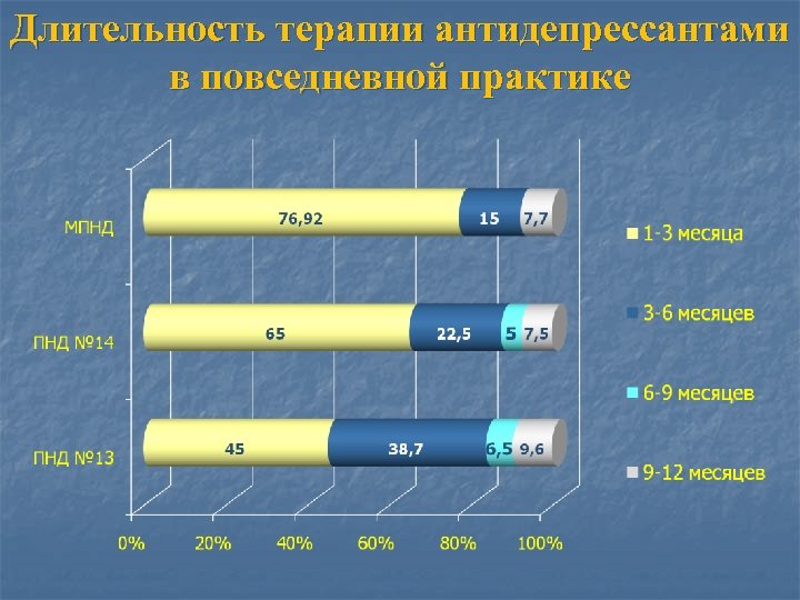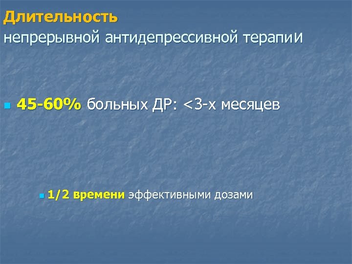 Длительность непрерывной антидепрессивной терапии n 45 -60% больных ДР: <3 -х месяцев n 1/2 времени эффективными дозами