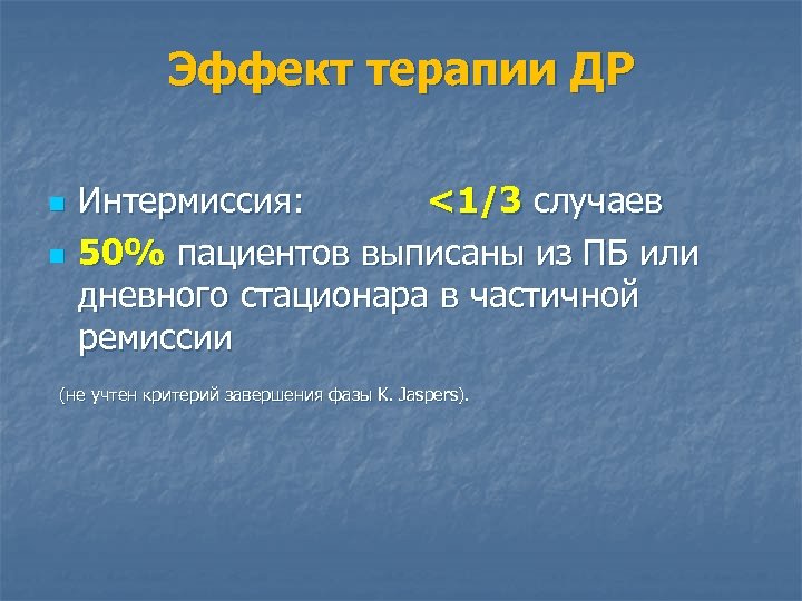 Эффект терапии ДР n n Интермиссия: <1/3 случаев 50% пациентов выписаны из ПБ или дневного стационара в частичной ремиссии (не учтен критерий завершения фазы K. Jaspers).