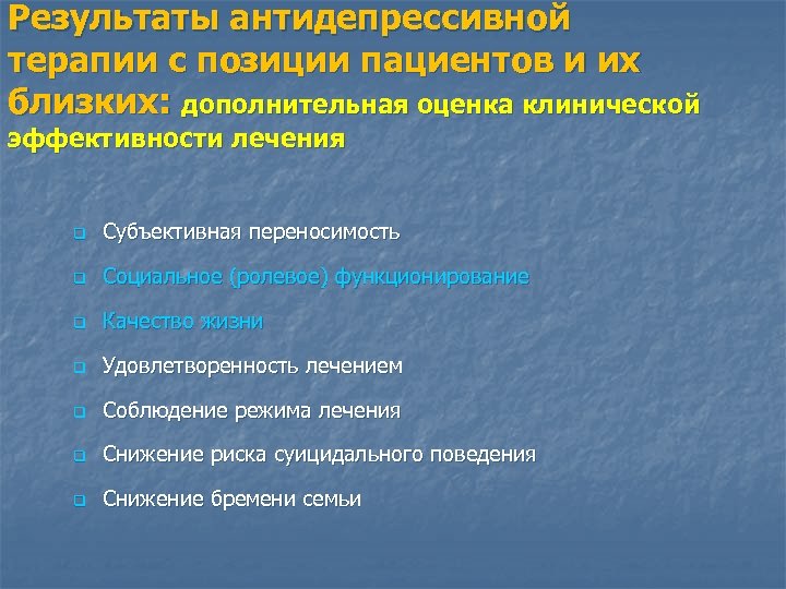 Результаты антидепрессивной терапии с позиции пациентов и их близких: дополнительная оценка клинической эффективности лечения q Субъективная переносимость q Социальное (ролевое) функционирование q Качество жизни q Удовлетворенность лечением q Соблюдение режима лечения q Снижение риска суицидального поведения q Снижение бремени семьи