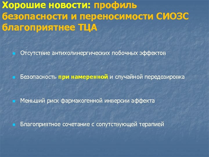 Хорошие новости: профиль безопасности и переносимости СИОЗС благоприятнее ТЦА n Отсутствие антихолинергических побочных эффектов n Безопасность при намеренной и случайной передозировка n Меньший риск фармакогенной инверсии аффекта n Благоприятное сочетание с сопутствующей терапией
