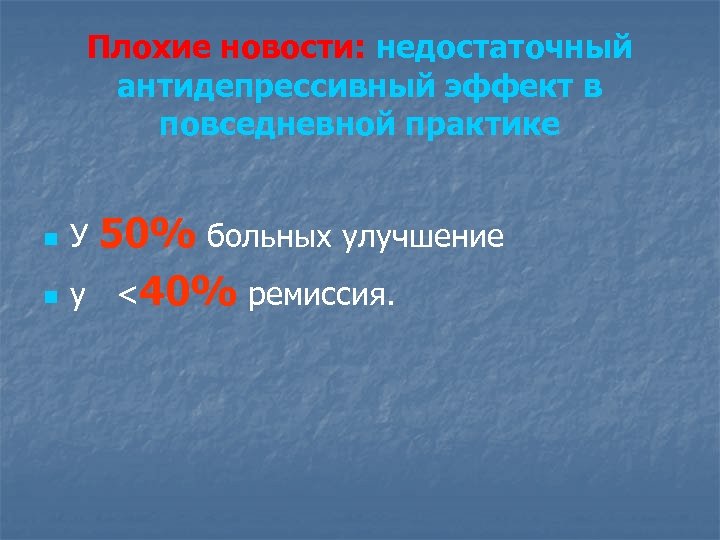 Плохие новости: недостаточный антидепрессивный эффект в повседневной практике n У 50% больных улучшение n у <40% ремиссия.