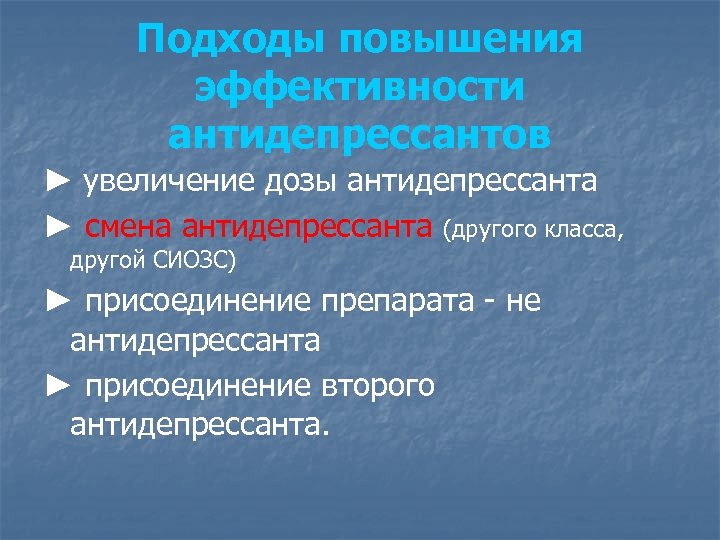 Подходы повышения эффективности антидепрессантов ► увеличение дозы антидепрессанта ► смена антидепрессанта (другого класса, другой СИОЗС) ► присоединение препарата - не антидепрессанта ► присоединение второго антидепрессанта.