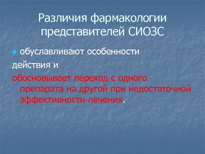 Различия фармакологии представителей СИОЗС обуславливают особенности действия и обосновывает переход с одного препарата на другой при недостаточной эффективности лечения. n