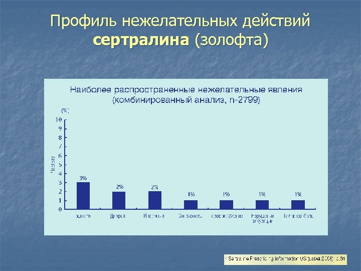 Сравнительная эффективность золофта и амитриптилина в лечении тяжелого депрессивного расстройства Баллы по шкале CGI 3. 5 † ‡ ‡ 3. 0 ‡ 2. 5 § § 2. 0 § ‡ 1. 5 1 †p 0. 05 ‡p 0. 01 Source: Reimherr et al. J Clin Psych, 1990 2 3 4 5 Недели лечения 6 § § 1. 0 §p<0. 001 ‡ § 7 8 Sertraline Amitriptyline