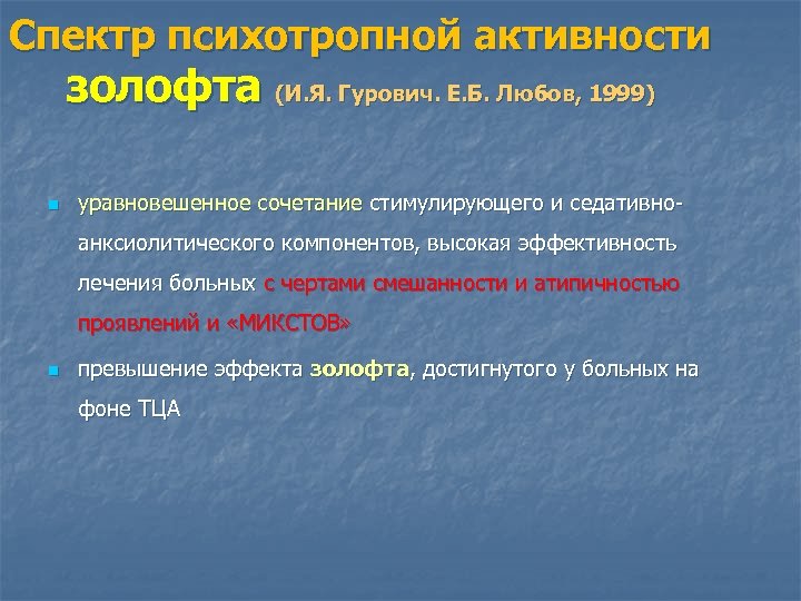 Спектр психотропной активности золофта (И. Я. Гурович. Е. Б. Любов, 1999) n уравновешенное сочетание стимулирующего и седативноанксиолитического компонентов, высокая эффективность лечения больных с чертами смешанности и атипичностью проявлений и «МИКСТОВ» n превышение эффекта золофта, достигнутого у больных на фоне ТЦА