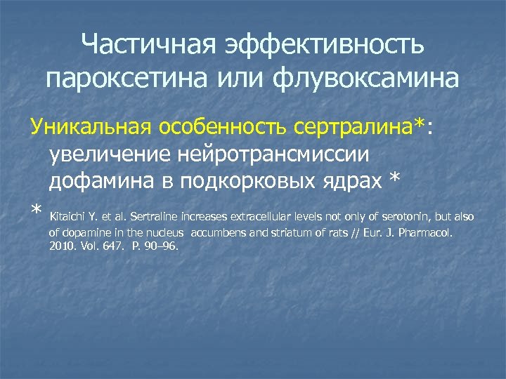 Частичная эффективность пароксетина или флувоксамина Уникальная особенность сертралина*: увеличение нейротрансмиссии дофамина в подкорковых ядрах * * Kitaichi Y. et al. Sertraline increases extracellular levels not only of serotonin, but also of dopamine in the nucleus accumbens and striatum of rats // Eur. J. Pharmacol. 2010. Vol. 647. P. 90– 96.