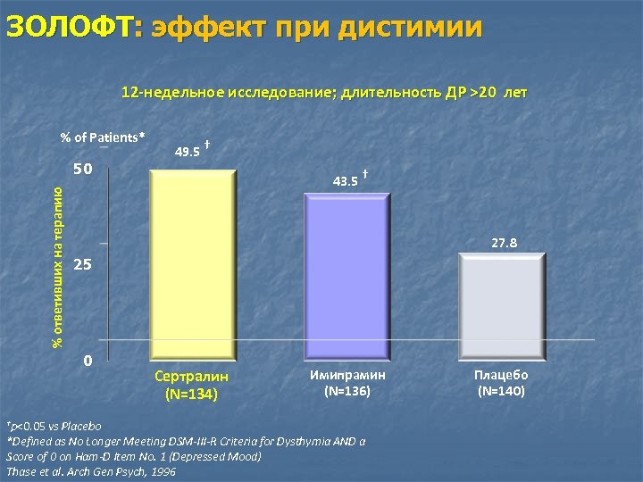 ЗОЛОФТ: эффект при дистимии 12 -недельное исследование; длительность ДР >20 лет % of Patients* % ответивших на терапию 50 43. 5 † 27. 8 25 0 †p<0. 05 49. 5 † Сертралин (N=134) Имипрамин (N=136) vs Placebo *Defined as No Longer Meeting DSM-III-R Criteria for Dysthymia AND a Score of 0 on Ham-D Item No. 1 (Depressed Mood) Thase et al. Arch Gen Psych, 1996 Плацебо (N=140)