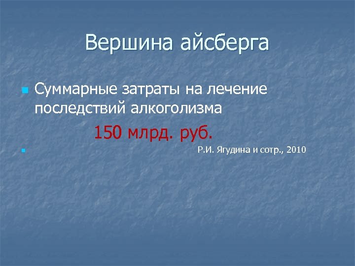 Вершина айсберга n Суммарные затраты на лечение последствий алкоголизма 150 млрд. руб. n Р. И. Ягудина и сотр. , 2010