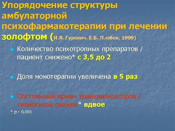Упорядочение структуры амбулаторной психофармакотерапии при лечении золофтом (И. Я. Гурович. Е. Б. Л. юбов, 1999) n n n Количество психотропных препаратов / пациент снижено* с 3, 5 до 2 Доля монотерапии увеличена в 5 раз Постоянный прием транквилизаторов / гипнотиков снижен* вдвое * р ‹ 0, 001