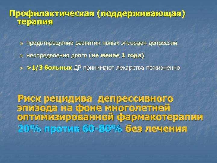 Профилактическая (поддерживающая) терапия Ø предотвращение развития новых эпизодов депрессии Ø неопределенно долго (не менее 1 года) Ø >1/3 больных ДР принимают лекарства пожизненно Риск рецидива депрессивного эпизода на фоне многолетней оптимизированной фармакотерапии 20% против 60 -80% без лечения