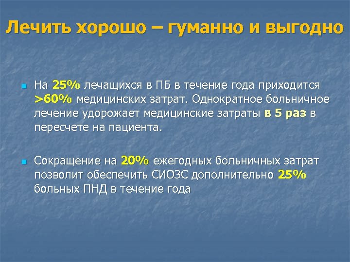 Лечить хорошо – гуманно и выгодно n n На 25% лечащихся в ПБ в течение года приходится >60% медицинских затрат. Однократное больничное лечение удорожает медицинские затраты в 5 раз в пересчете на пациента. Сокращение на 20% ежегодных больничных затрат позволит обеспечить СИОЗС дополнительно 25% больных ПНД в течение года