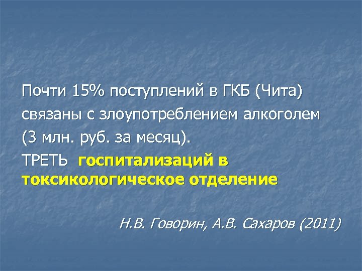 Почти 15% поступлений в ГКБ (Чита) связаны с злоупотреблением алкоголем (3 млн. руб. за месяц). ТРЕТЬ госпитализаций в токсикологическое отделение Н. В. Говорин, А. В. Сахаров (2011)
