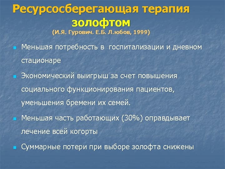 Ресурсосберегающая терапия золофтом (И. Я. Гурович. Е. Б. Л. юбов, 1999) n Меньшая потребность в госпитализации и дневном стационаре n Экономический выигрыш за счет повышения социального функционирования пациентов, уменьшения бремени их семей. n Меньшая часть работающих (30%) оправдывает лечение всей когорты n Суммарные потери при выборе золофта снижены