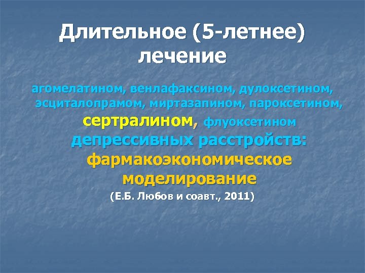 Длительное (5 -летнее) лечение агомелатином, венлафаксином, дулоксетином, эсциталопрамом, миртазапином, пароксетином, сертралином, флуоксетином депрессивных расстройств: фармакоэкономическое моделирование (Е. Б. Любов и соавт. , 2011)