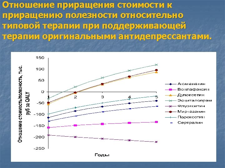Отношение приращения стоимости к приращению полезности относительно типовой терапии при поддерживающей терапии оригинальными антидепрессантами.