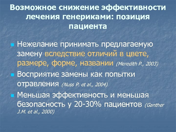Возможное снижение эффективности лечения генериками: позиция пациента n n n Нежелание принимать предлагаемую замену вследствие отличий в цвете, размере, форме, названии (Meredith P. , 2003) Восприятие замены как попытки отравления (Nuss P. et al. , 2004) Меньшая эффективность и меньшая безопасность у 20 -30% пациентов (Ganther J. M. et al. , 2000)