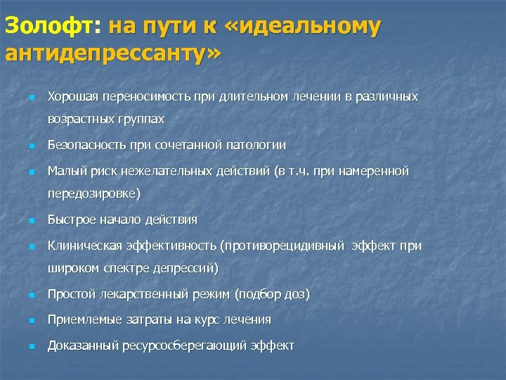Золофт: на пути к «идеальному антидепрессанту» n Хорошая переносимость при длительном лечении в различных возрастных группах n Безопасность при сочетанной патологии n Малый риск нежелательных действий (в т. ч. при намеренной передозировке) n Быстрое начало действия n Клиническая эффективность (противорецидивный эффект при широком спектре депрессий) n Простой лекарственный режим (подбор доз) n Приемлемые затраты на курс лечения n Доказанный ресурсосберегающий эффект