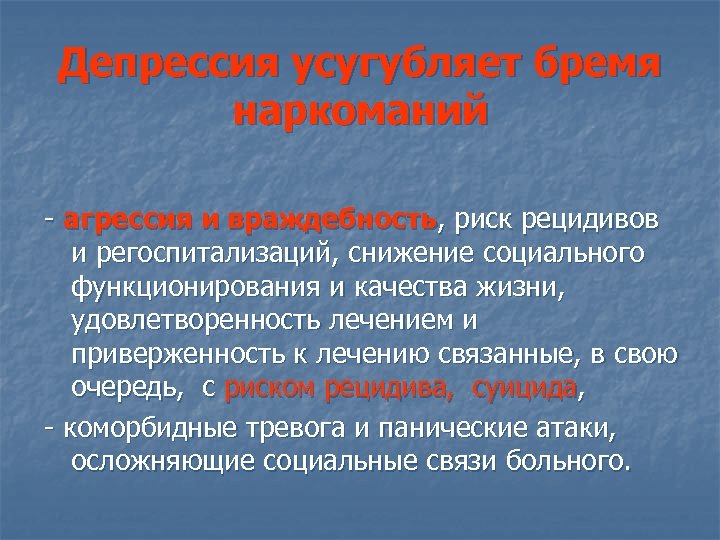 Депрессия усугубляет бремя наркоманий - агрессия и враждебность, риск рецидивов и регоспитализаций, снижение социального функционирования и качества жизни, удовлетворенность лечением и приверженность к лечению связанные, в свою очередь, с риском рецидива, суицида, - коморбидные тревога и панические атаки, осложняющие социальные связи больного.