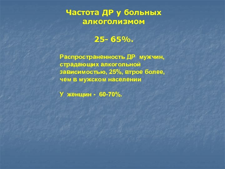 Частота ДР у больных алкоголизмом 25 - 65%. Распространенность ДР мужчин, страдающих алкогольной зависимостью, 25%, втрое более, чем в мужском населении У женщин - 60 -70%.
