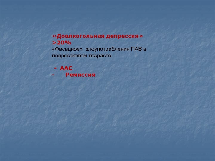 «Доалкогольная депрессия» >20% «Фвсадное» злоупотребления ПАВ в подростковом возрасте. - ААС Ремиссия
