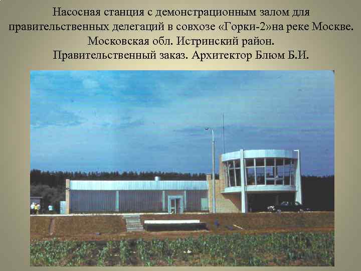 Насосная станция с демонстрационным залом для правительственных делегаций в совхозе «Горки-2» на реке Москве. Московская обл. Истринский район. Правительственный заказ. Архитектор Блюм Б. И. .