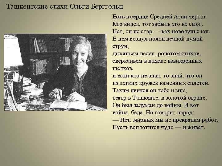 Ташкентские стихи Ольги Берггольц Есть в сердце Средней Азии чертог. Кто видел, тот забыть его не смог. Нет, он не стар — как новолунье юн. В нем воздух полон вечной думой струн, дыханьем песен, ропотом стихов, сверканьем в пляске взвихренных шелков, и если кто не знал, то знай, что он из легких кружев каменных сплетен. Таким явился он тебе и мне, театр в Ташкенте, в золотой стране. Он был задуман до войны. И вот война, беда. Но говорит народ: — Нет, мирных мы не прекратим работ. Пусть воплотится чудо — и живет.