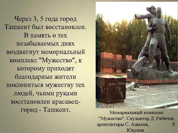 Через 3, 5 года город Ташкент был восстановлен. В память о тех незабываемых днях воздвигнут мемориальный комплекс "Мужество", к которому приходят благодарные жители поклониться мужеству тех людей, чьими руками восстановлен красавецгород - Ташкент. Мемориальный комплекс "Мужество". Скульптор Д. Рябичев, архитекторы С. Адылов, Р. Юсупов.
