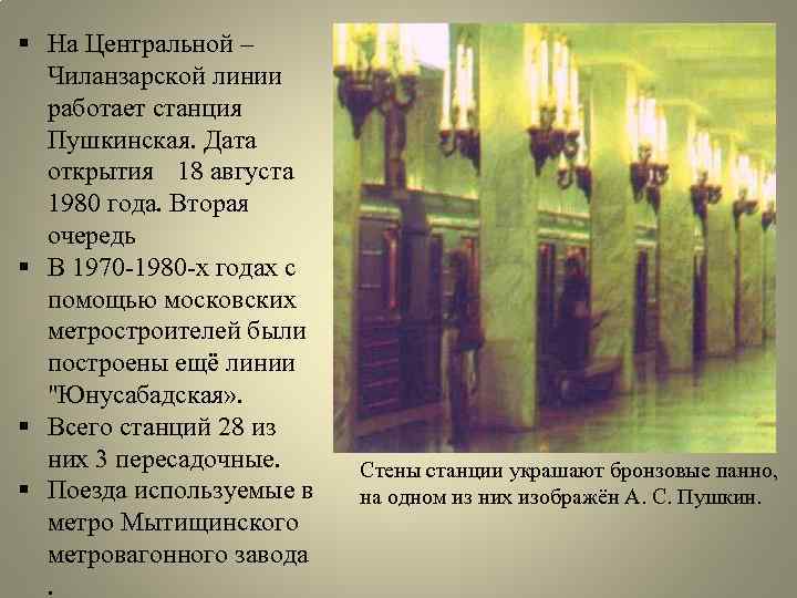 § На Центральной – Чиланзарской линии работает станция Пушкинская. Дата открытия 18 августа 1980 года. Вторая очередь § В 1970 -1980 -х годах с помощью московских метростроителей были построены ещё линии "Юнусабадская» . § Всего станций 28 из них 3 пересадочные. § Поезда используемые в метро Мытищинского метровагонного завода. Стены станции украшают бронзовые панно, на одном из них изображён А. С. Пушкин.