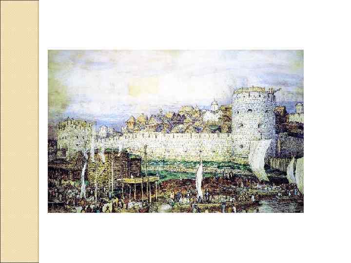 Основные этапы в историческом развитии города Первое упоминание - указание Ипатьевской летописи (1147) В 1156 построены новые деревянные укрепления. Общая территория увеличилась в 3— 4 раза В 1237— 1238 (монголо-татарское нашествие) Москва была разграблена и сожжена, однако её вскоре восстановили Во второй половине XIII в Москва стала центром самостоятельного удельного княжества. В XIV в - возвышение Москвы как центра Великого княжества Московского. в 1589 учреждена Московская патриархия В XIV — начале XV в Москва была крупным торговым и ремесленным городом; в её состав входили территории Кремля, Китай-города, и слобод в Замоскворечье, Занеглименье и Заяузье В конце XV в Москва становится столицей крупнейшего русского государства