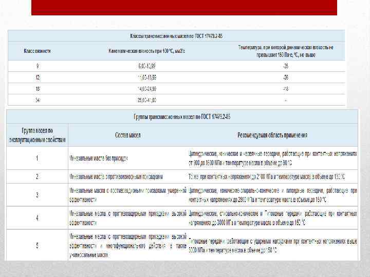 Для обеспечения надежной и длительной работы агрегатов трансмиссий смазочные масла должны обладать определенными характеристиками: • иметь достаточные противозадирные, противоизносные и противопиттинговые свойства; • обладать высокой антиокислительной стабильностью; • иметь хорошие вязкостно-температурные свойства; • не оказывать коррозионного воздействия на детали трансмиссии; • иметь хорошие защитные свойства при контакте с водой; • обладать достаточной совместимостью с резиновыми уплотнениями; • иметь хорошие антипенные свойства; • иметь высокую физическую стабильность в условиях длительного хранения.