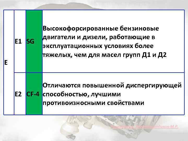 Е 1 SG Е Высокофорсированные бензиновые двигатели и дизели, работающие в эксплуатационных условиях более тяжелых, чем для масел групп Д 1 и Д 2 Отличаются повышенной диспергирующей Е 2 CF-4 способностью, лучшими противоизносными свойствами