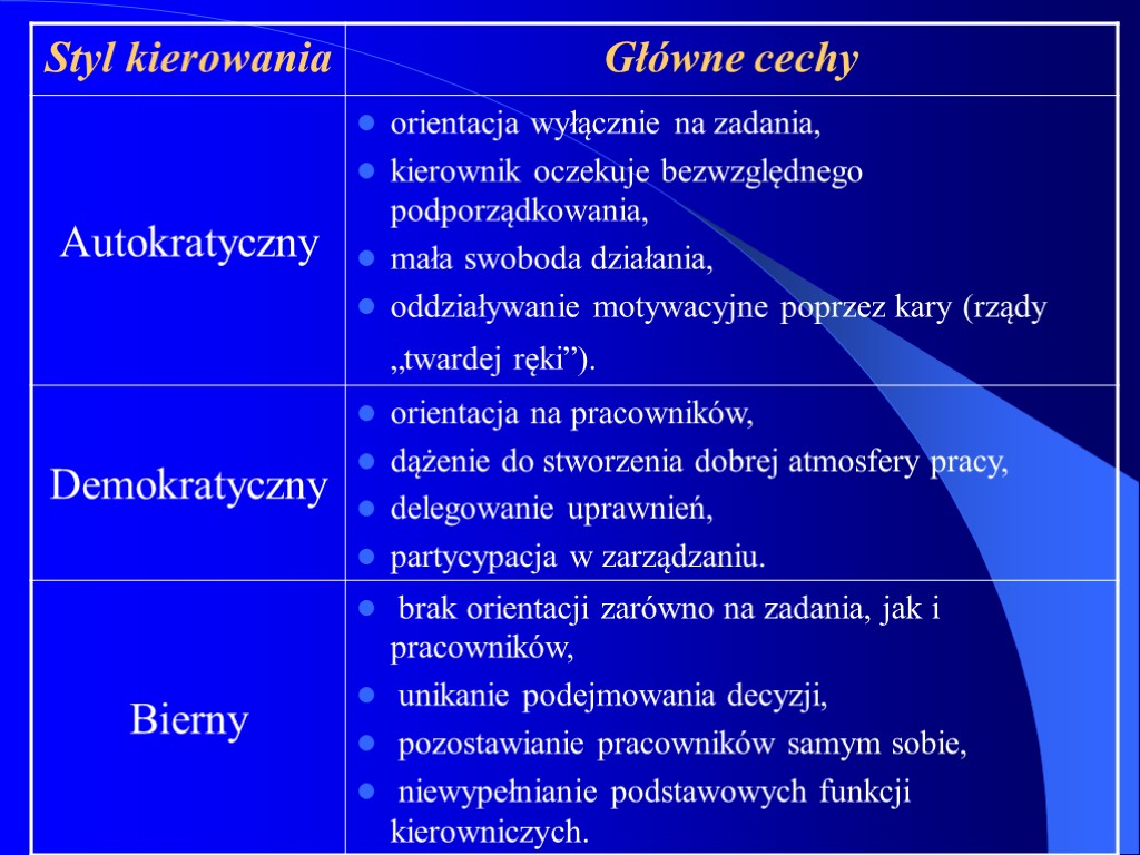 Style kierowania Styl kierowania to całokształt sposobów oddziaływania przełożonego na podwładnych w celu skłonienia ich do wypełniania ról organizacyjnych. Podstawowe style kierowania (wg R. Lippitt’a i K. White’a) Styl autokratyczny Styl demokratyczny Styl bierny (nie ingerujący, laissez-faire)