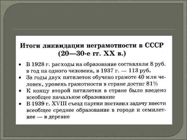 Образование С началом индустриализации большой проблемой стало недостаточное количество квалифицированных рабочих и инженеров В 1930 -м году повсеместно было введено обязательное четырехлетнее образование В городах – обязательное семилетнее образование, с проф. уклоном Открыто 3, 6 тысяч школ К началу 40 -х годов 4500 вузов Рост специалистов В школу возвращены старые, осужденные после революции методы обучения: уроки, предметы, расписания, экзамены, оценки, строгая дисциплина, система наказаний К концу 30 -х годов СССР на 1 -ом месте в мире по числу учащихся