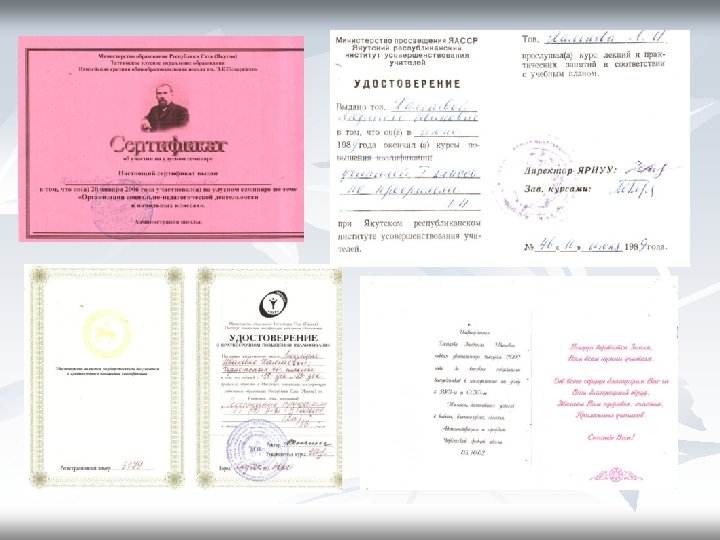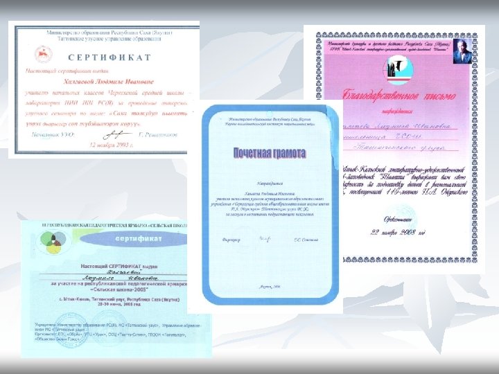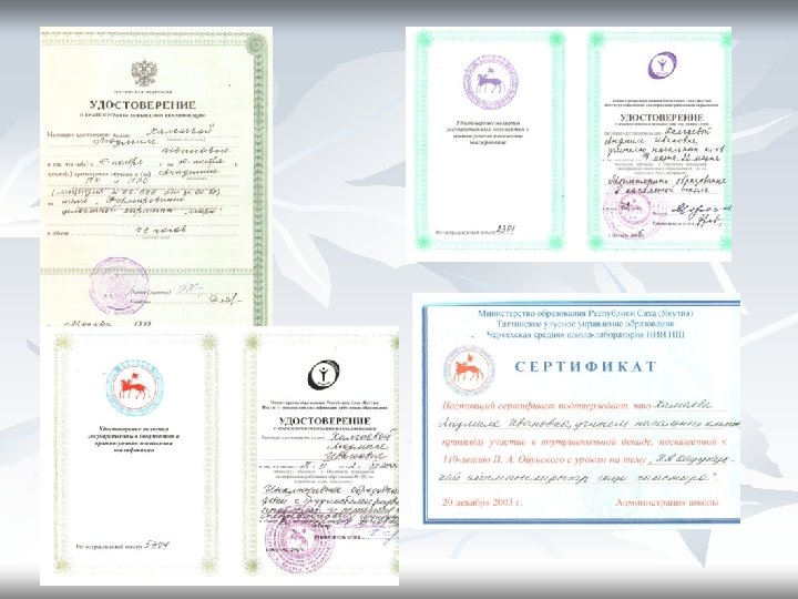 Курсы повышения квалификации Наименование Дата Место прохождения № удостоверения Мониторинг образования в начальной школе 2005 г. Якутск ИПКРО 2361 Инклюзивное образование детей с трудностями развития: проблемы и решения в специфических социокультурных условиях 2008 г. Якутск ИПКРО 5704