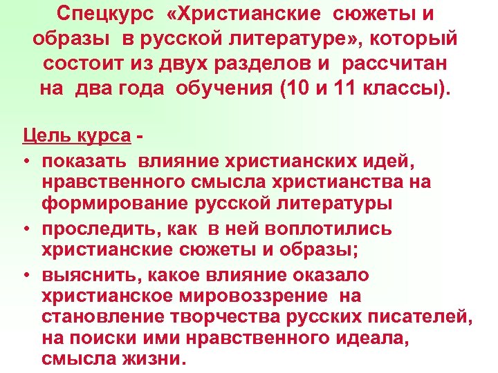 Спецкурс «Христианские сюжеты и образы в русской литературе» , который состоит из двух разделов и рассчитан на два года обучения (10 и 11 классы). Цель курса • показать влияние христианских идей, нравственного смысла христианства на формирование русской литературы • проследить, как в ней воплотились христианские сюжеты и образы; • выяснить, какое влияние оказало христианское мировоззрение на становление творчества русских писателей, на поиски ими нравственного идеала, смысла жизни.