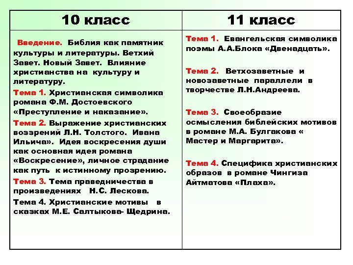 10 класс Введение. Библия как памятник культуры и литературы. Ветхий Завет. Новый Завет. Влияние христианства на культуру и литературу. Тема 1. Христианская символика романа Ф. М. Достоевского «Преступление и наказание» . Тема 2. Выражение христианских воззрений Л. Н. Толстого. Ивана Ильича» . Идея воскресения души как основная идея романа «Воскресение» , личное страдание как путь к истинному прозрению. Тема 3. Тема праведничества в произведениях Н. С. Лескова. Тема 4. Христианские мотивы в сказках М. Е. Салтыкова- Щедрина. 11 класс Тема 1. Евангельская символика поэмы А. А. Блока «Двенадцать» . Тема 2. Ветхозаветные и новозаветные параллели в творчестве Л. Н. Андреева. Тема 3. Своеобразие осмысления библейских мотивов в романе М. А. Булгакова « Мастер и Маргарита» . Тема 4. Специфика христианских образов в романе Чингиза Айтматова «Плаха» .
