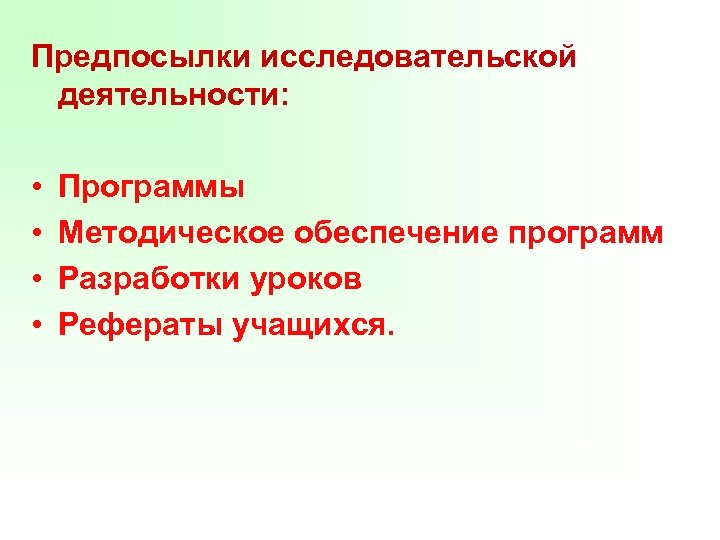 Предпосылки исследовательской деятельности: • • Программы Методическое обеспечение программ Разработки уроков Рефераты учащихся.
