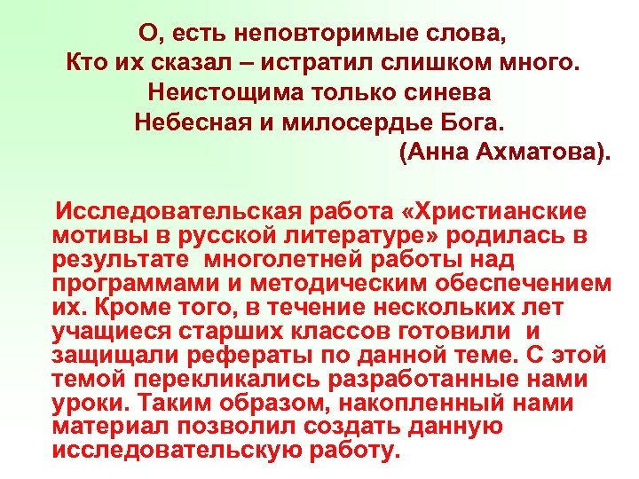 О, есть неповторимые слова, Кто их сказал – истратил слишком много. Неистощима только синева Небесная и милосердье Бога. (Анна Ахматова). Исследовательская работа «Христианские мотивы в русской литературе» родилась в результате многолетней работы над программами и методическим обеспечением их. Кроме того, в течение нескольких лет учащиеся старших классов готовили и защищали рефераты по данной теме. С этой темой перекликались разработанные нами уроки. Таким образом, накопленный нами материал позволил создать данную исследовательскую работу.