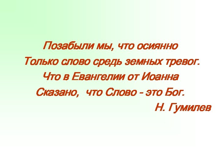 Позабыли мы, что осиянно Только слово средь земных тревог. Что в Евангелии от Иоанна Сказано, что Слово - это Бог. Н. Гумилев