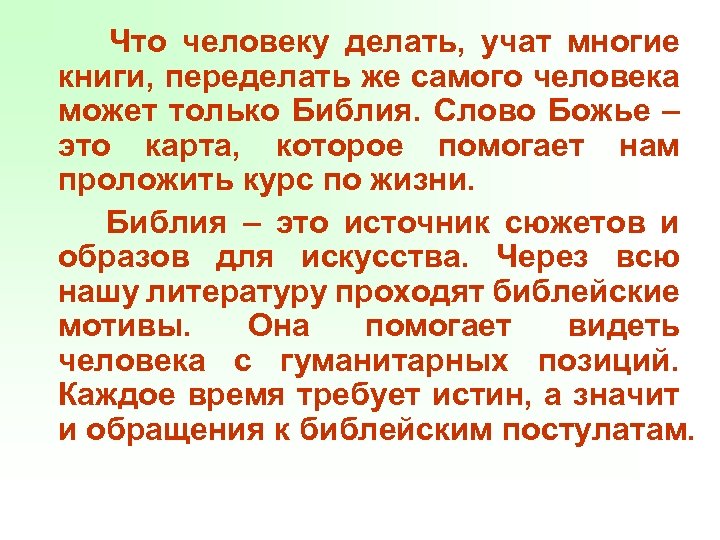 Что человеку делать, учат многие книги, переделать же самого человека может только Библия. Слово Божье – это карта, которое помогает нам проложить курс по жизни. Библия – это источник сюжетов и образов для искусства. Через всю нашу литературу проходят библейские мотивы. Она помогает видеть человека с гуманитарных позиций. Каждое время требует истин, а значит и обращения к библейским постулатам.