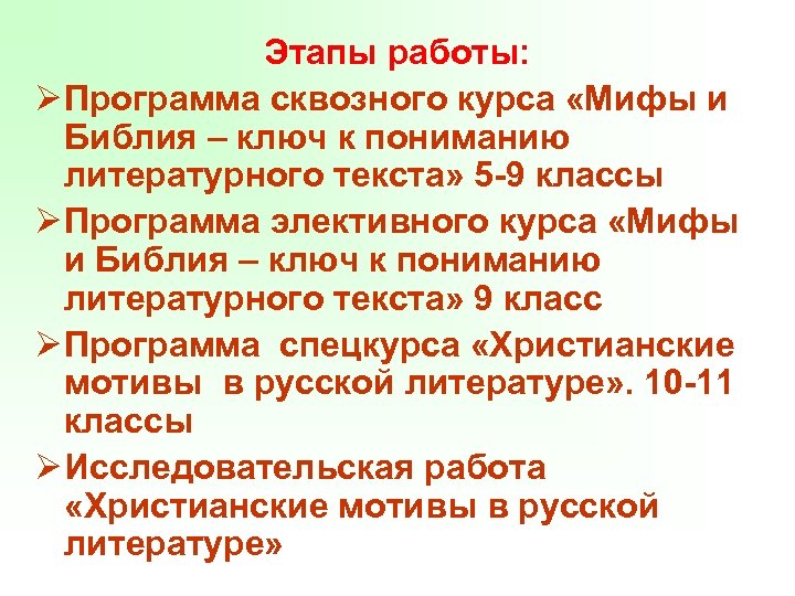 Этапы работы: Ø Программа сквозного курса «Мифы и Библия – ключ к пониманию литературного текста» 5 -9 классы Ø Программа элективного курса «Мифы и Библия – ключ к пониманию литературного текста» 9 класс Ø Программа спецкурса «Христианские мотивы в русской литературе» . 10 -11 классы Ø Исследовательская работа «Христианские мотивы в русской литературе»