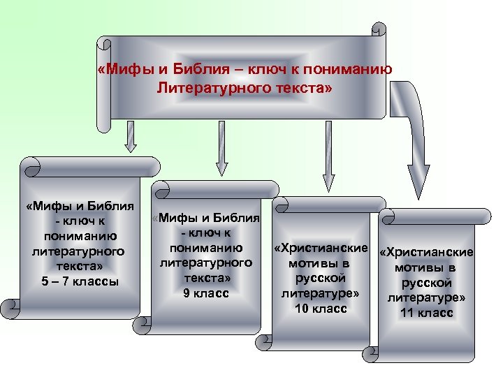 «Мифы и Библия – ключ к пониманию Литературного текста» «Мифы и Библия - ключ к пониманию литературного текста» 5 – 7 классы «Мифы и Библия - ключ к пониманию литературного текста» 9 класс «Христианские мотивы в русской литературе» 10 класс 11 класс