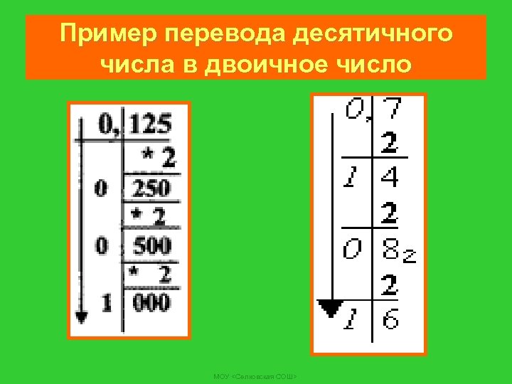 Пример перевода десятичного числа в двоичное число МОУ <Селковская СОШ>