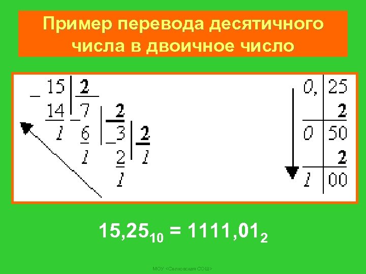 Пример перевода десятичного числа в двоичное число 15, 2510 = 1111, 012 МОУ <Селковская СОШ>