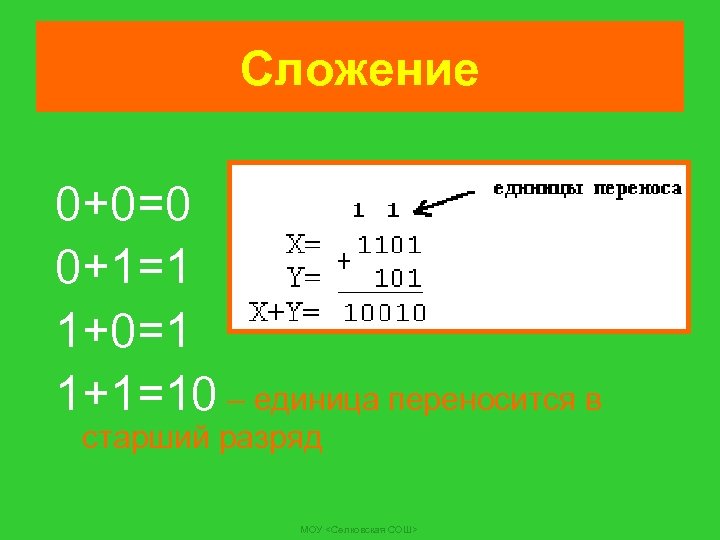Сложение 0+0=0 0+1=1 1+0=1 1+1=10 – единица переносится в старший разряд МОУ <Селковская СОШ>